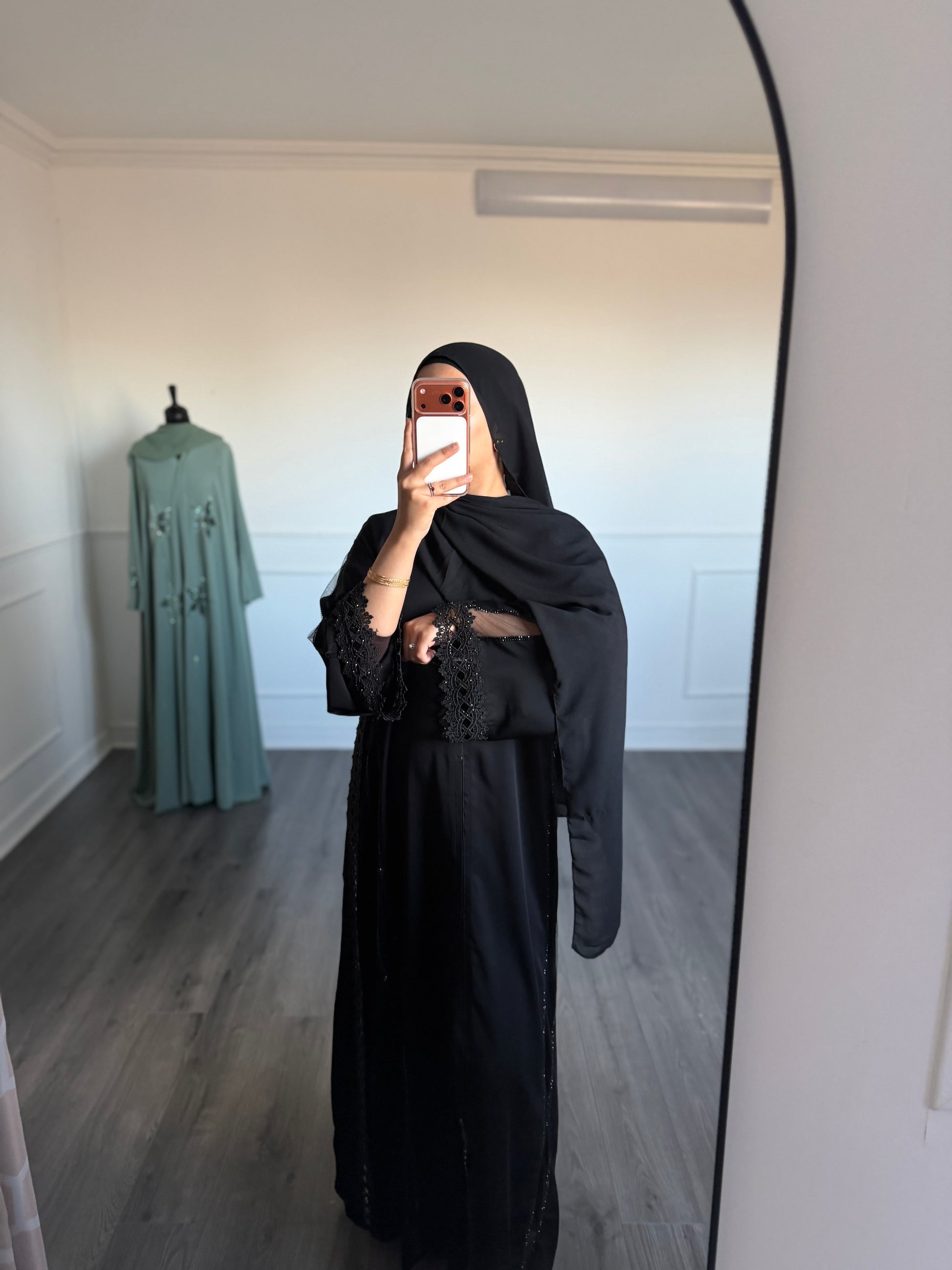 Cette Abaya est boutonnée jusqu'au mollet, avec des détails en dentelle et toile sur le côté. Les manches sont transparentes et le voile est inclus.